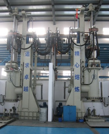 3、P型炉子概况:一个上炉体,一套电源,一套真空系统,一套电气控制系统,两个交替工作的工位,即两套固定坩埚(坩埚上部设置插板阀)及冷却水套,炉身由一框架支撑并可沿框架副导轨升降和绕坩埚旋转,电极装入和铸锭卸出均为炉身升起并旋转至另一个工位后,由吊装工具完成。