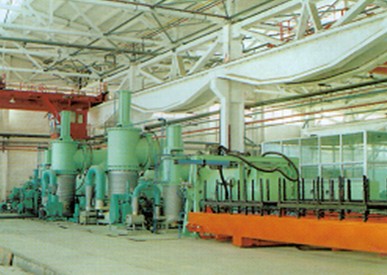 30米内热卧式管材连续式真空退火炉:是由固定真空炉体(三段式:预热段、加热段、冷却段,各段由两闭锁阀隔开,预热段与冷却段可交替轮换)、 真空机组(三套)、